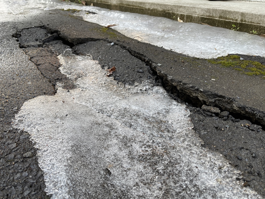 本堂裏手の墓地への道。 アスファルトに 亀裂が入って 一部陥没しているのが分かりました。 お墓の工事であったり 灯油をつめる時などに 車両が通る中で 徐々に沈んでいったのかもしれません。 二十数年の間 一度も舗装したことがないので 暖かくなったら こちらの工